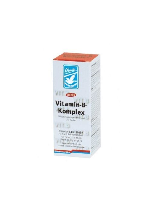 Ergänzungsfuttermittel für TaubenBacks Vitamin-B-Komplex hat seine besondere Bedeutung in der Steuerung des Stoffwechsels von Eiweißen, Kohlehydraten und Fetten. B-Vitamine können im Körper nur sehr begrenzt gespeichert werden. Deshalb empfiehlt sich eine Verabreichung immer dann, wenn vom Organismus erhöhte Leistungen gefordert werden. Ein Mangel an B-Vitaminen kann eine gestörte Embryonalentwicklung, Wachstumsstörungen, mangelhafte Befiederung oder Krankheiten des Nerven- und Muskelsystems zur Folge haben.Zusammensetzung: Propylenglykol, DextroseZusatzstoffe je kg:7800 mg Vitamin B13900 mg Vitamin B23300 mg Vitamin B615000 mg Vitamin B124500 mg Pantothensäure50000 mg NicotinsäureKonservierungsstoff: Kaliumsorbat, Natriumpropionat, ZitronensäureAnwendungshinweise: Während der Zucht und der Mauser 2 x wöchentlich, während der Reise am Tag vor dem Einsetzen und am Heimkehrtag, nach medikamentösen Behandlungen und Impfungen 5 Tage hintereinander verabreichen.Dosierung: 5 ml auf 1 Liter Trinkwasser oder für 25 Tauben über das Futter verabreichen.Hinweis: Kühl und vor Licht geschützt lagern!Nettovolumen: 100 mlReg.Nr.: DE-NI-2-00024Hersteller-.Nr.: DE-NI-2-00024