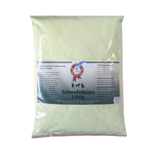 Straight feeding stuff for horses, dogs, cats and birds Dovita Vital Sulphur Flower offers a versatile solution for the health and well-being of pets, especially birds. This high-quality sulphur flower powder can be used both internally and externally and is an aid for pet owners. The areas of application of Dovita Vital Sulphur Flower are extensive. It can be used for parasite infestations such as mites, hair lice or lice to provide effective and gentle relief. It is also a proven solution for skin diseases, moulting and other coat growth disorders. It also aids digestion and helps to alleviate digestive problems. Especially during the moulting period, sulphur flower is an invaluable support for birds. It promotes new feather formation and helps birds to develop healthy and strong feathers. This is crucial for their well-being and vitality. The quality and purity make it a trusted choice for pet owners. Manufactured under strict quality standards, this product provides reliable support for the health and well-being of pets. Discover the many uses of Dovita Vital Sulphur Flower today and ensure your pets receive the care and attention they deserve.