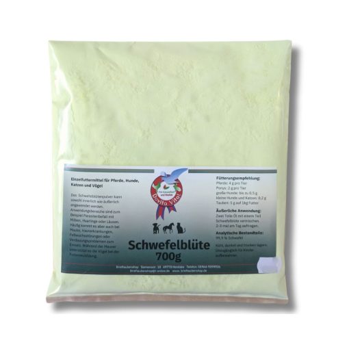 Straight feeding stuff for horses, dogs, cats and birds Dovita Vital Sulphur Flower offers a versatile solution for the health and well-being of pets, especially birds. This high-quality sulphur flower powder can be used both internally and externally and is an aid for pet owners. The areas of application of Dovita Vital Sulphur Flower are extensive. It can be used for parasite infestations such as mites, hair lice or lice to provide effective and gentle relief. It is also a proven solution for skin diseases, moulting and other coat growth disorders. It also aids digestion and helps to alleviate digestive problems. Especially during the moulting period, sulphur flower is an invaluable support for birds. It promotes new feather formation and helps birds to develop healthy and strong feathers. This is crucial for their well-being and vitality. The quality and purity make it a trusted choice for pet owners. Manufactured under strict quality standards, this product provides reliable support for the health and well-being of pets. Discover the many uses of Dovita Vital Sulphur Flower today and ensure your pets receive the care and attention they deserve.