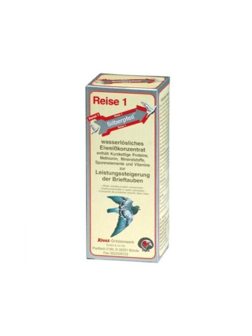 Silberpfeil® – Reise 1 is a water-soluble, high-quality EGG WHITE CONCENTRATE to improve the protein supply after the flight. Short-chain proteins, i.e. activated animal proteins converted into an easily digestible form, make up 55% of the key ingredients in this preparation. Methionine, minerals, trace elements and vitamins support protein metabolism and are therefore an essential component of this product. Instructions for use: In the evening after returning home and on the following day, Voyage 1 is administered via the drinking water or in the feed. Dosage: 1 teaspoon (5g) per liter of water or via the daily amount of feed for approx. 20 pigeons. Important: When administered via the drinking water, the preparation must be freshly prepared every 12 hours and the drinking trough thoroughly cleaned. Composition: Collagen hydrolyzate from pigs, whey protein, yeast extract, sodium dihydrogen phosphate, lactose powder, dextrose, magnesium sulphate Analytical constituents: Crude protein 53%, crude fiber 1%, crude fat 1%, crude ash 16.5%, sodium 2%, phosphorus 2.2%, methionine 5.5%, lysine 2.5% Additives per kg: