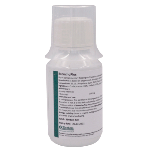 – BronchoPlus is a balanced formulation based on various natural essential oils based on peppermint, eucalyptus oil and menthol. The composition of BronchoPlus helps pigeons to reduce the amount of excess mucus in the airways.