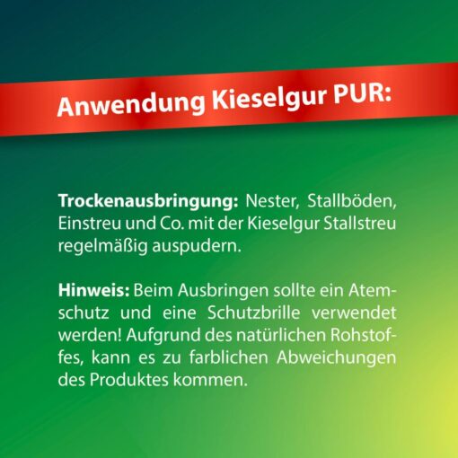 Kieselguhr PUR is composed of 100% finely ground diatoms. Thanks to its versatile properties, it offers a wide range of benefits. For example, it binds moisture in the barn, which helps to optimize the natural barn climate. Dry application: Regularly powder out nests, stable floors, litter etc. with Kieselgur stable litter. Liquid application: Thoroughly mix 1/5 Kieselgur PUR with 4/5 water. This mixture can then be applied to the entire stable with a brush or garden sprayer. Net volume: 600g Storage: dry and sealed Application: Dust diatomaceous earth powder into corners, cracks and laying nests so that a white coating forms everywhere. For dust-free application, mix the diatomaceous earth powder 1:5 with water and spray onto surfaces such as stable walls and furnishings using a garden sprayer, for example. Note: Respiratory protection and safety goggles should be used when spraying! Ingredients: