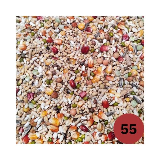 Composition: Pro Immun Pellet, Red French Corn, Cribbs Corn Bordeaux, Cribbs Corn yellow small, Wheat light, Barley light hulled, Milo Corn red, Dari white, Oats hulled, Cargo Rice, Cardy Seed, Hulled sunflower seeds, linseed, rapeseed, negro seed, hemp seed, flat seed, katjang idjoe, vetches, toasted soybeans, dunpeas, small green peas, lentils, wild seeds/weed seeds, milk thistle