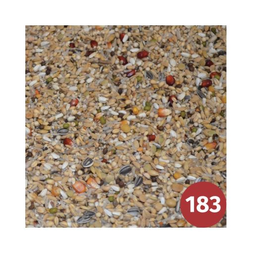 Composition: Kribbs corn red no. 76, Bordeaux corn red no. 200, Cribbs corn yellow small no. 198, light wheat, light barley, red milocorn, white dari, oat kernels, paddy rice, paddy rice, white cardy seed, striped sunflower seeds, hemp seed, yellow millet, canary seed, vetches, Katjang Idjoe (mung beans), toasted soybeans, white perilla seed, lentils, wild seeds, milk thistle seed, sesame seed, “Superieur” seeds no. 74 Nutritional values: crude fat 10.6, crude protein 13.5, utilizable protein 7.5, carbohydrates 53.8, crude fibre 8.3, kilo/calories 3515