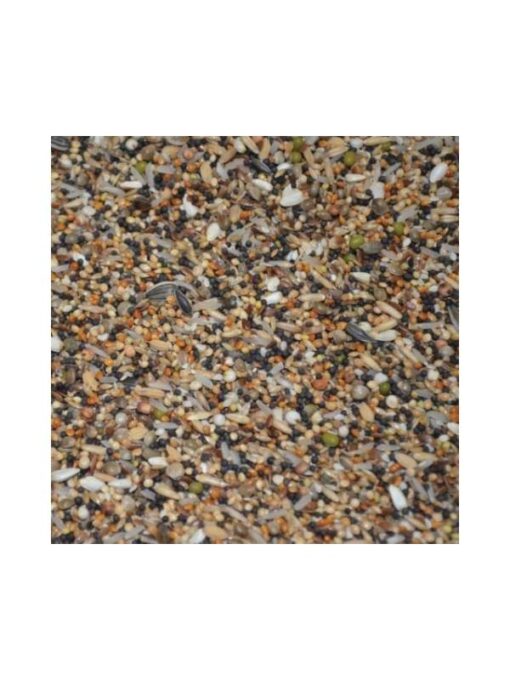 Composition: Milocorn red, Dari white, oat kernels, paddy rice, paddy rice, cardy seed white, sunflower seeds striped, linseed, rapeseed germinable, rapeseed, hemp seed, millet silver / red / plata, canary seed, Katjang Idjoe (mung beans), wild seeds, sesame seed