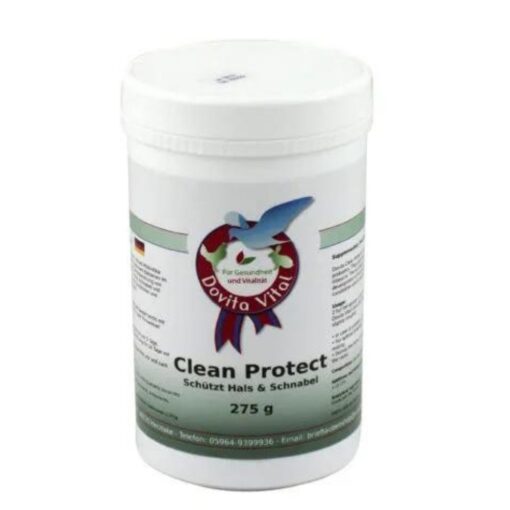 Dovita Clean Protect bietet speziellen Zucker, der als Probiotika wirkt, er aktiviert das Wachstum der nützlichen Bakterien im Darm. Die Ansäuerung des Darms hemmt die Entwicklung von schädlichen Bakterien. Das Produkt ist für Hals, Schnabel und Schleimhäute. Es ist ein hyperaktiver Darm- Conditioner und verstärkt die Wirkung, den Darm zu schützen. Dovita Clean ist bei den Preisflügen unerlässlich um der Taube eine schnelle Rückkehr zu ermöglichen. Tauben mit Dovita Clean sind leistungsfähiger und überzeugen durch eine gute Orientierung.
