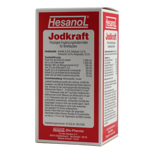 Lösung zum Eingeben über das Trinkwasser für Brieftauben. Zur Leistungssteigerung – mehr Geschwindigkeit – mehr Gesundheit – mehr Kraft und Form, zur Trinkwasserdesinfektion. JODKRAFT beeinflusst positiv die Leistung, erhöht die Ausdauer. JODKRAFT wirkt positiv auf die Schilddrüsenfunktion. Fettreiche Körnerarten während der Reise und Mauser erhöhen beträchtlich den Jodbedarf, darum brauchen Ihre Tauben JODKRAFT. JODKRAFT enthält viel aktives Eisen, das leicht löslich ist und schnell ins Blut geht. Hierdurch wird die Bildung von roten Blutkörperchen gefördert