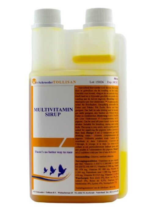 Zusatzstoffe: Vitamine und Provitamine per Liter: Vitamin A (E671) 1.500.000 Ul, Vitamin D3 (E672) 168.000 Ul, Vitamin E 500 mg, Vitamin B1 470 mg, Vitamin B2 400 mg, Nicotinsäure 5.200 mg, Pantothensäure 1.380 mg, Vitamin B6 430 mg, Vitamin B12 0,5 mg, Vitamin C 5.200 mg