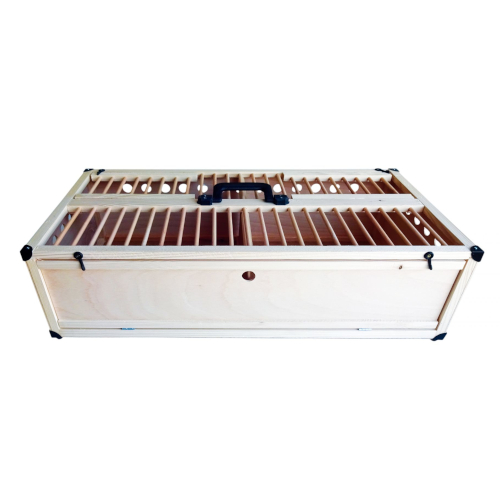Der funktionelle Korb mit einem bequemen Griff aus Kunststoff dient dem Transport von Tauben.